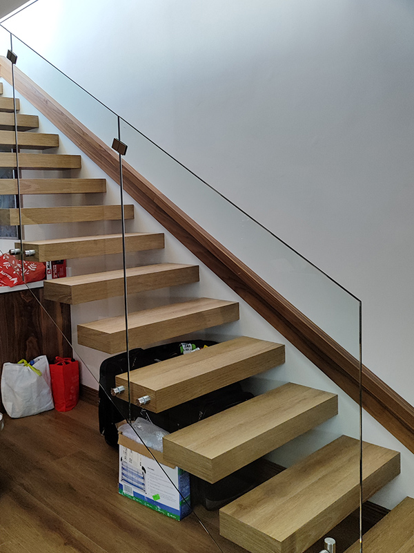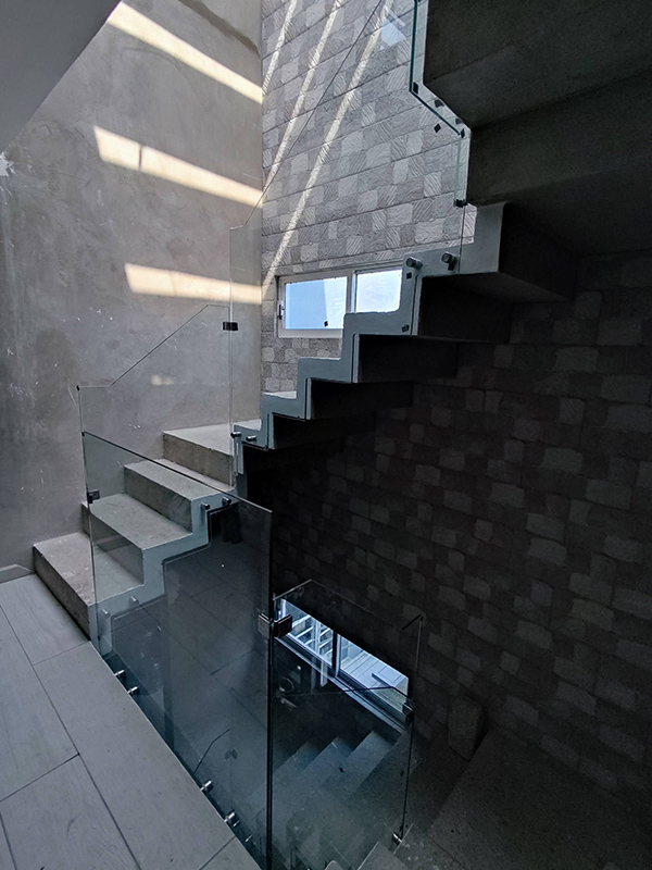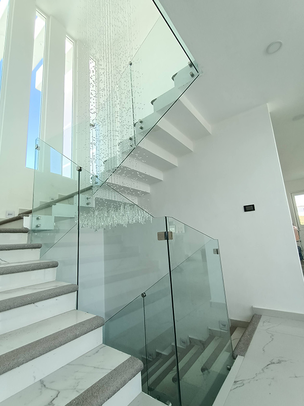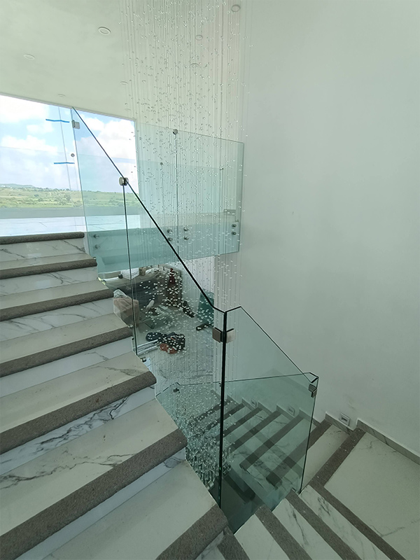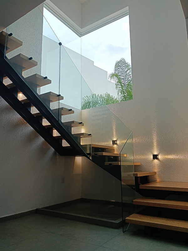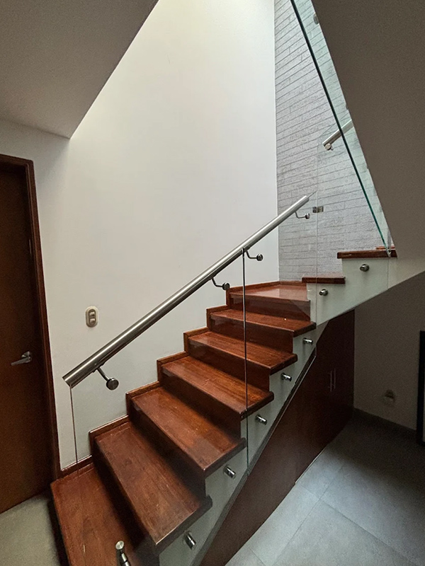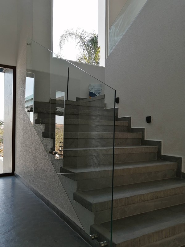 Barandal fabricado con pantallas de cristal templado 10 mm, sujetadas con conectores redondos de acero inoxidable anclados al costado de los escalones, estabilizadores tipo hamburguesa y clip estabilizador para esquinas. Con o sin pasamanos con una altura total de 100 cm.
