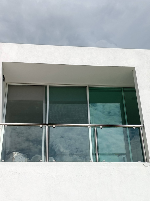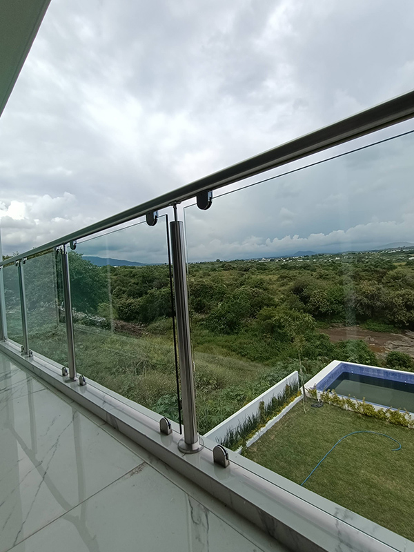 Barandal fabricado con pasamanos redondo y postes verticales de 2” en acero inoxidable calidad 304, con pantallas de cristal templado 10 mm sujetas con grapa a presion instaladas al pasamanos y loza. Con una altura total de 100 cm