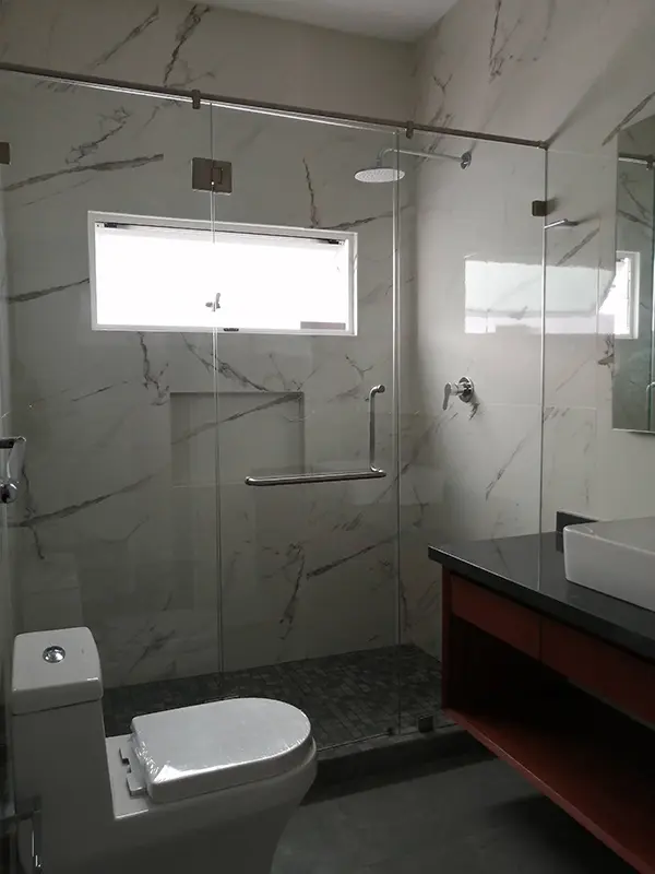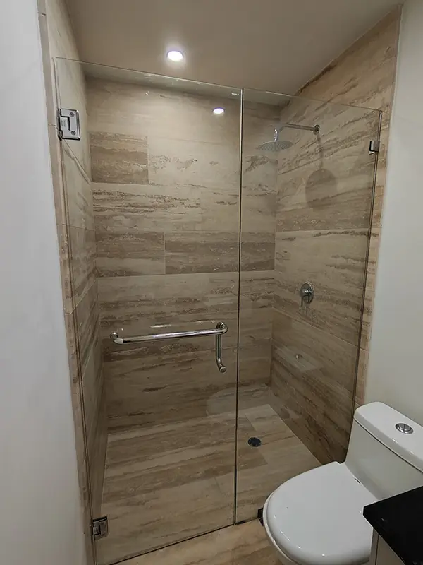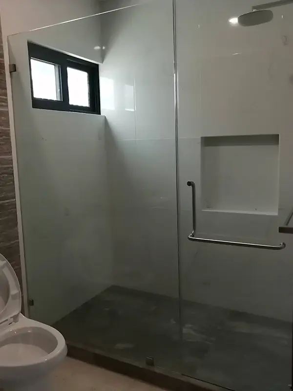 Cancel de baño fabricado con cristal templado de 10 mm claro y herrajes de acero inoxidable que aseguran resistencia y durabilidad. Cuenta con hoja fija y una puerta abatible con sistema de bisagras y jaladera toallero, ideal para un baño moderno y funcional.